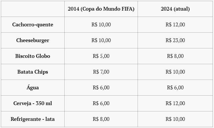 A experiência gastronômica no Maracanã também reflete o processo de elitização do estádio. Um simples lanche no Maracanã pode custar o equivalente a uma refeição completa em um restaurante nos arredores do estádio. O encarecimento das comidas e bebidas deu um salto em 2014, durante a preparação para a Copa do Mundo. Na época, as mudanças foram assunto de matérias no Jornal Extra e no UOL. Dez anos depois, o torcedor que vai ao Maracanã encontra um cenário ainda mais frustrante nos bares e lanchonetes do estádio, onde os preços são inflacionados e desproporcionais. Confira as mudanças: